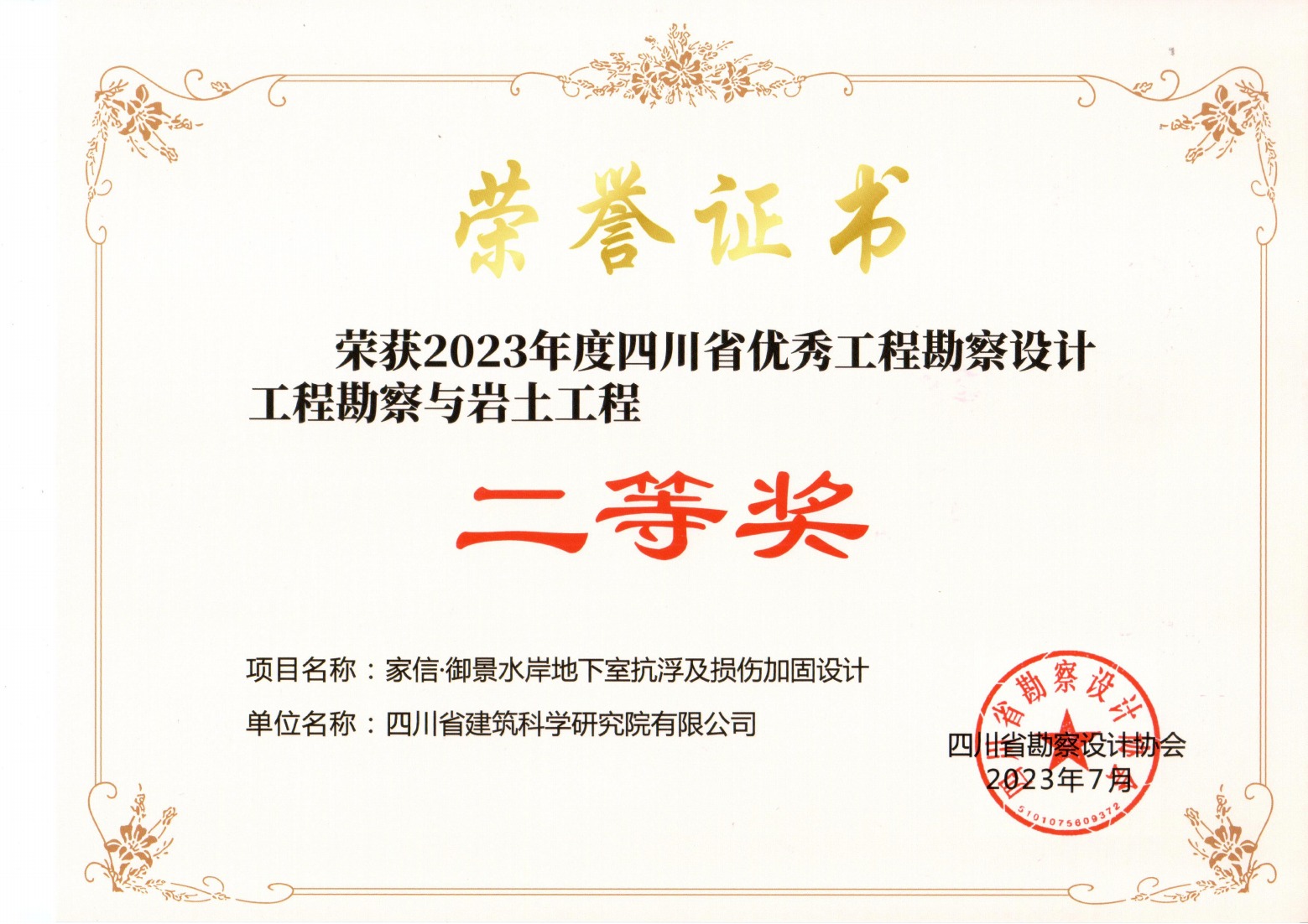 2023年四川省优秀工程勘察设计 工程勘察与岩土项目 二等奖-家信·御景水岸地下室抗浮及损伤加固设计